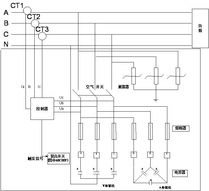 補償裝置主要由柜體、控制器、空氣開關(guān)、避雷器、電容器、熔斷器和復合開關(guān)等組成。其主電路圖如下(方框內(nèi)部是補償裝置主電路;方框外部是低壓配電網(wǎng)):