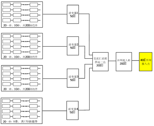 交流匯流箱配置在水泥屋頂,滿足四進(jìn)一出接入需求,出線通過交流電纜連接至在原有低壓配電室。